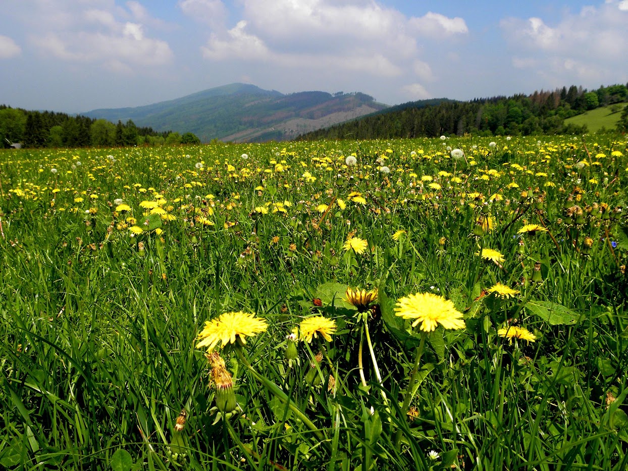 Ruszamy dalej żółtym szlakiem schodzimy do Heřmanovic w pobliżu źródeł Złotego Potoku. Za wsią wkraczamy w jedno z moich ulubionych miejsc w Opawskich – górskie łąki pastwiska na stokach Solnej Hory. Pełno tutaj żółtych kwiatów mleczy, krowy mierzą nas wzrokiem a wokół piękne widoki na okolicę po Pradziada. Na łąkach widzimy samotnego cielaka. Postanawiamy zobaczyć go z bliska, maluch musi mieć zaledwie kilka dni ponieważ ma jeszcze trudności z chodzeniem. Najpierw chętnie pozuje do zdjęć, ale po chwili mu się już nudzi.