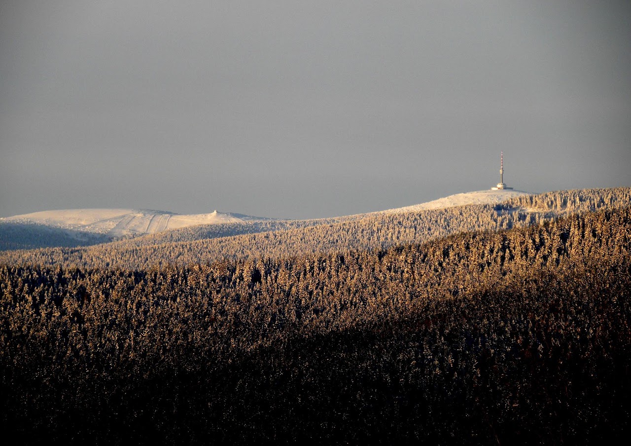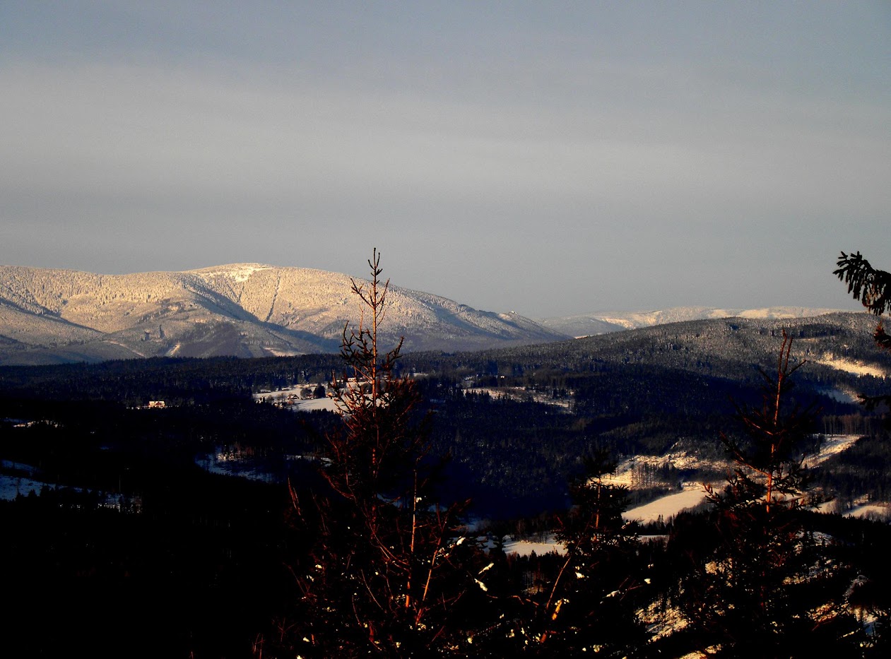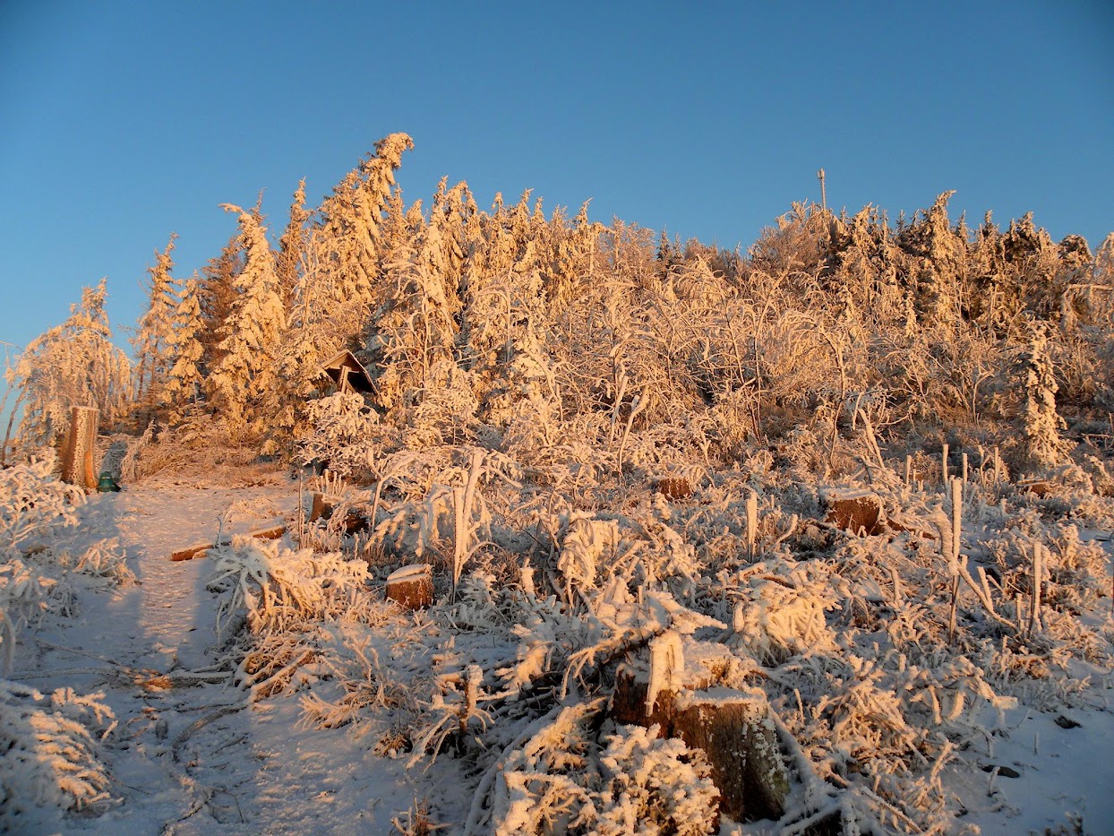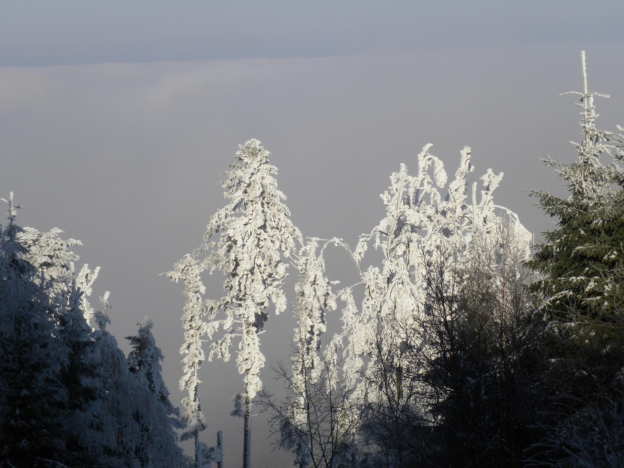 Kolejna widokowa wycieczka miała miejsce 15 stycznia. Ten dzień na Biskupiej Kopie spędziłem od wschodu do zachodu słońca. Pokonałem 26 km kręcąc się po masywie, na wierzchołku byłem 3 razy, dodatkowo wlazłem jeszcze na Srebrną Kopę. Resztę czasu spędziłem w schronisku. Również panowała niska temperatura około -15°C, było mało śniegu, ale szadź pozostawiona na drzewach po kilku mglistych dniach była bajeczna. Liczyłem na dalekie obserwacje o wschodzie słońca i też się przeliczyłem, choć poprzedniego dnia 14 stycznia popołudniu zapowiadało się nieźle, gdy mgła opadła w doliny powstało morze chmur.