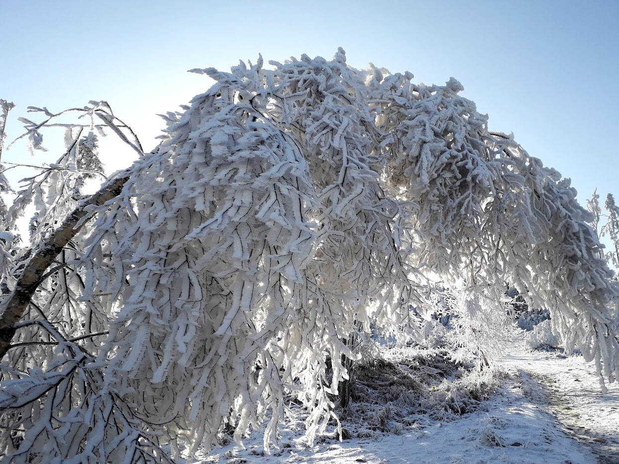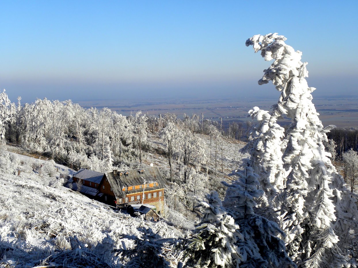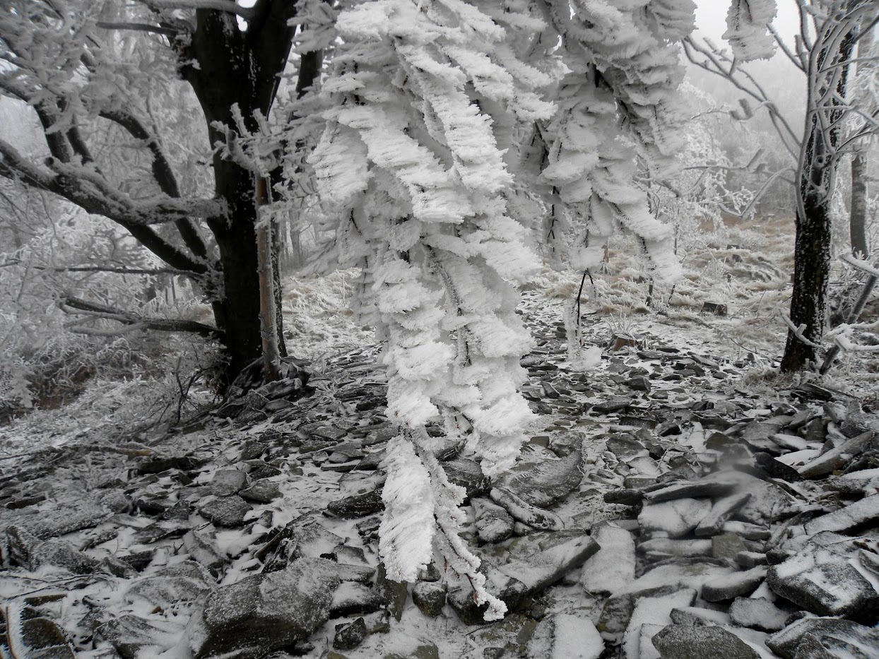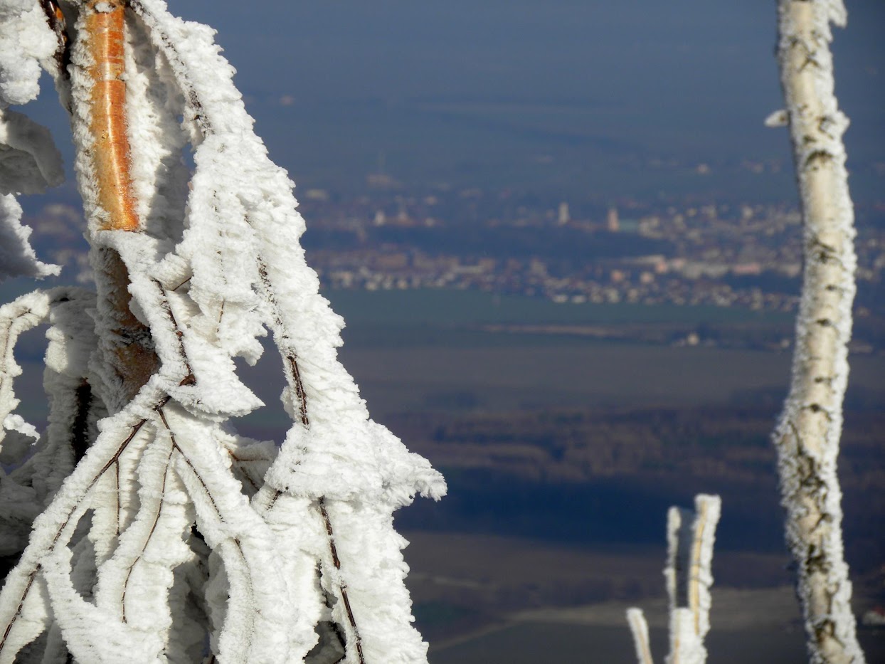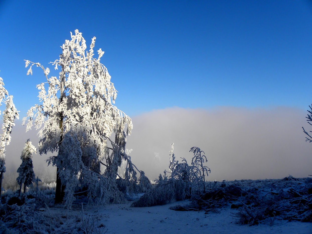 Kolejna widokowa wycieczka miała miejsce 15 stycznia. Ten dzień na Biskupiej Kopie spędziłem od wschodu do zachodu słońca. Pokonałem 26 km kręcąc się po masywie, na wierzchołku byłem 3 razy, dodatkowo wlazłem jeszcze na Srebrną Kopę. Resztę czasu spędziłem w schronisku. Również panowała niska temperatura około -15°C, było mało śniegu, ale szadź pozostawiona na drzewach po kilku mglistych dniach była bajeczna. Liczyłem na dalekie obserwacje o wschodzie słońca i też się przeliczyłem, choć poprzedniego dnia 14 stycznia popołudniu zapowiadało się nieźle, gdy mgła opadła w doliny powstało morze chmur.