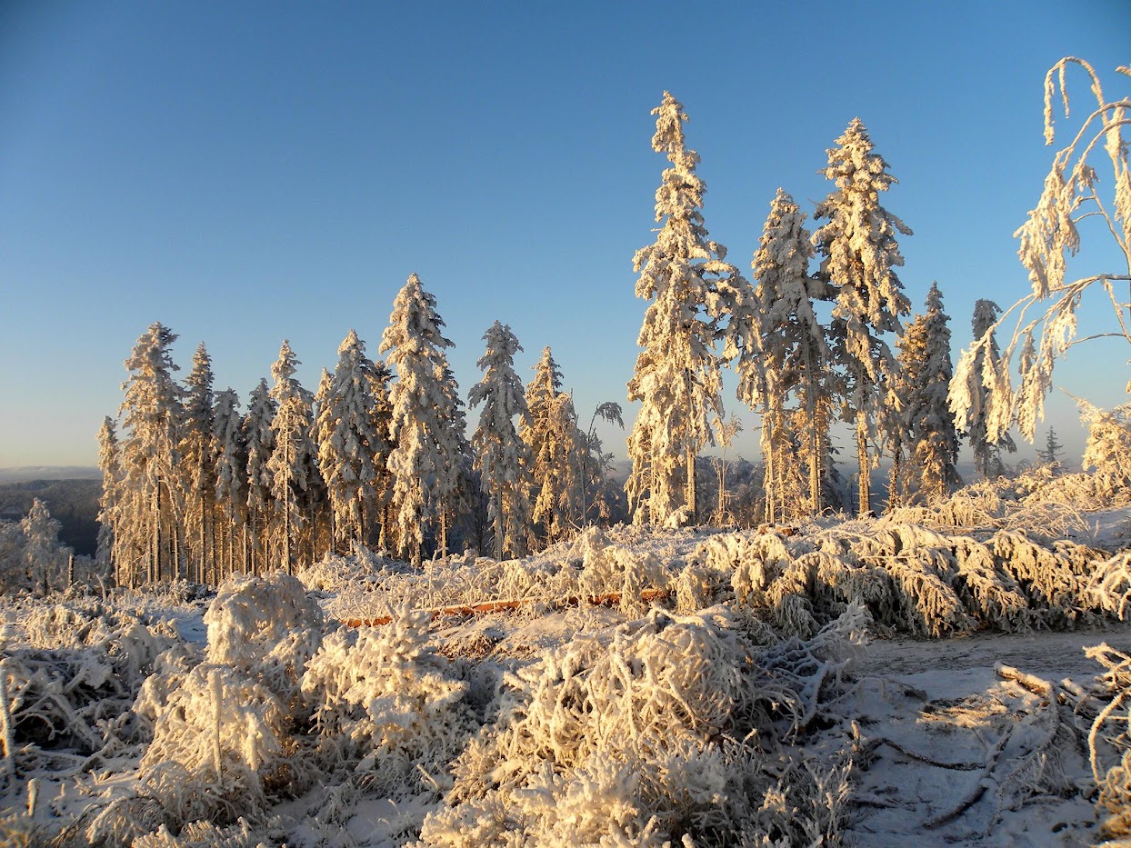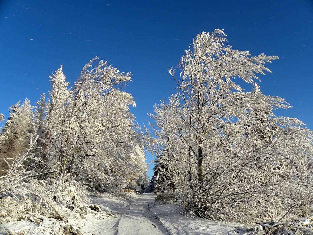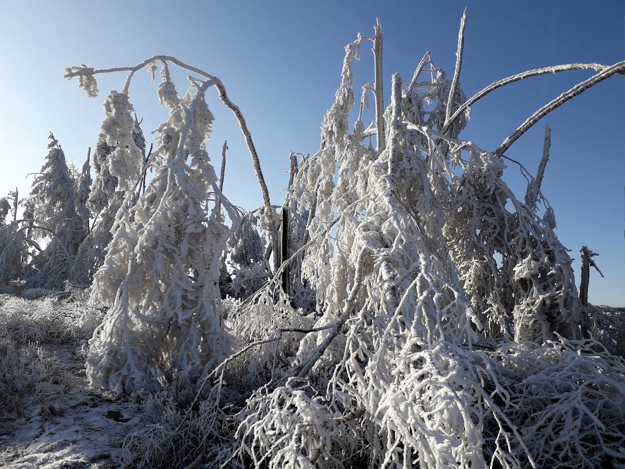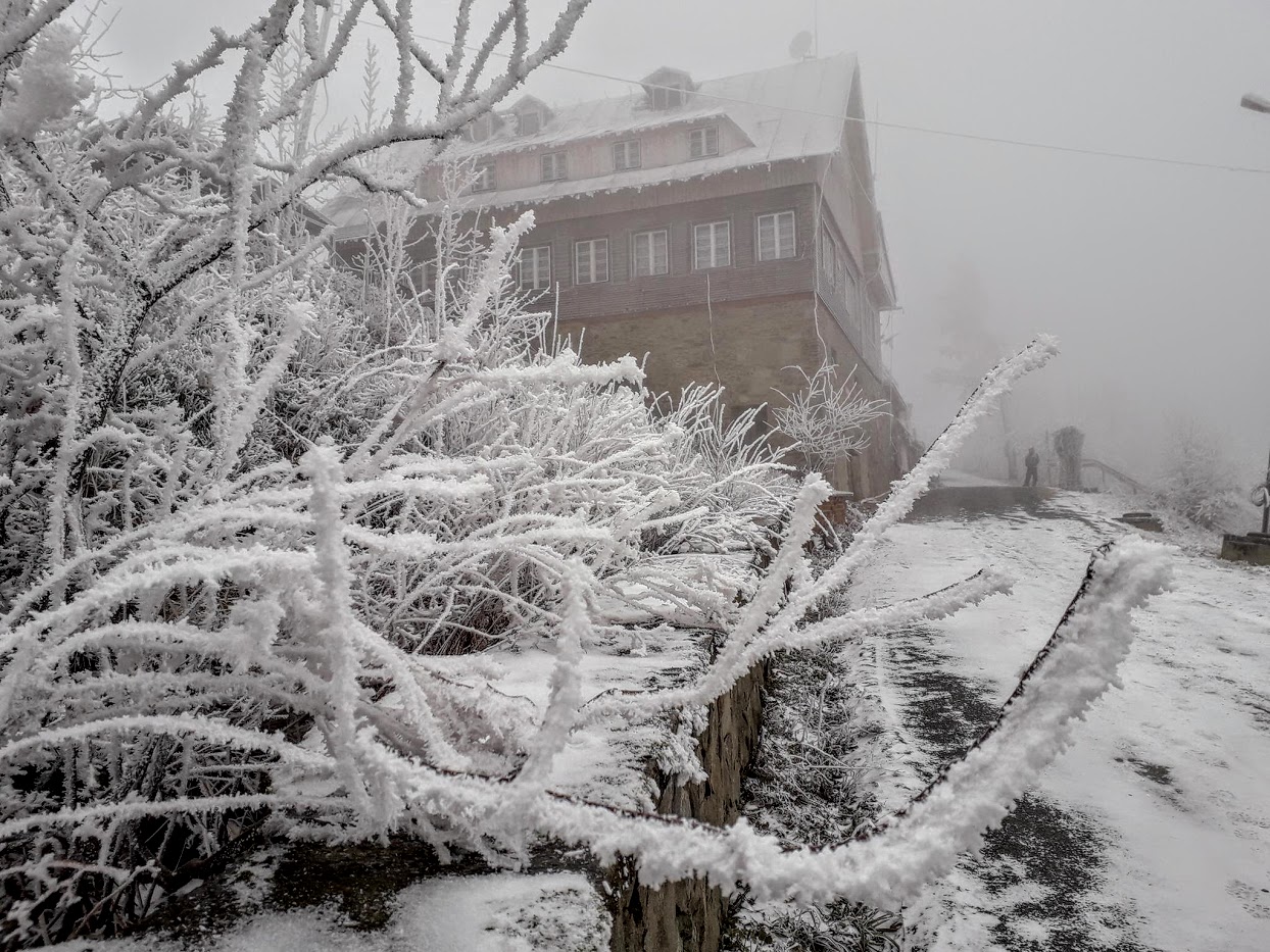 Kolejna widokowa wycieczka miała miejsce 15 stycznia. Ten dzień na Biskupiej Kopie spędziłem od wschodu do zachodu słońca. Pokonałem 26 km kręcąc się po masywie, na wierzchołku byłem 3 razy, dodatkowo wlazłem jeszcze na Srebrną Kopę. Resztę czasu spędziłem w schronisku. Również panowała niska temperatura około -15°C, było mało śniegu, ale szadź pozostawiona na drzewach po kilku mglistych dniach była bajeczna. Liczyłem na dalekie obserwacje o wschodzie słońca i też się przeliczyłem, choć poprzedniego dnia 14 stycznia popołudniu zapowiadało się nieźle, gdy mgła opadła w doliny powstało morze chmur.