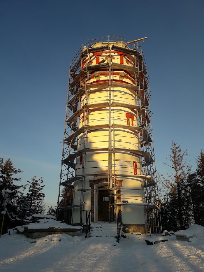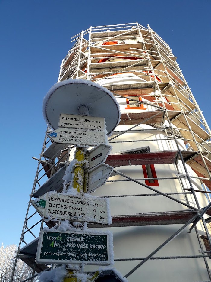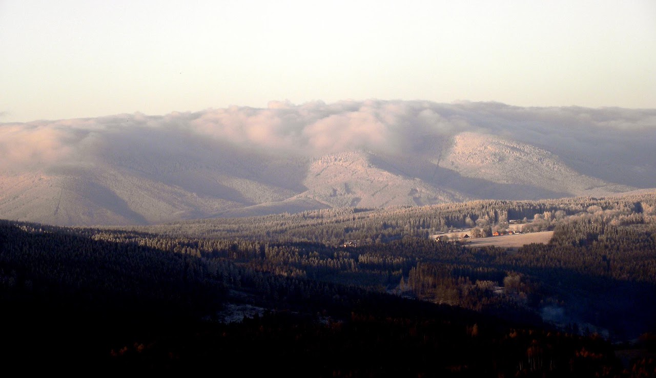 | Zlaty Chlum, nad nim skryty w chmurach Śnieżnik |