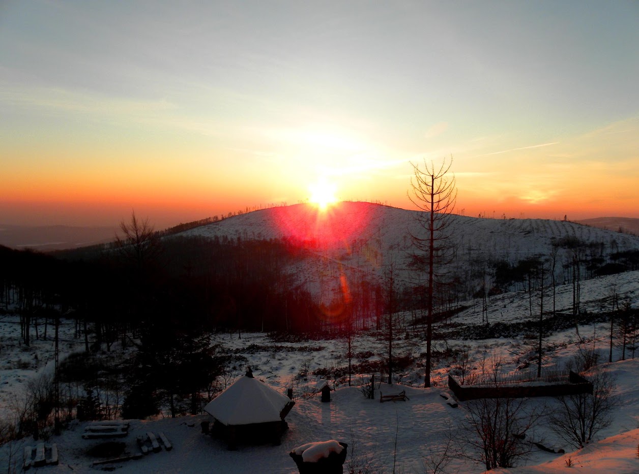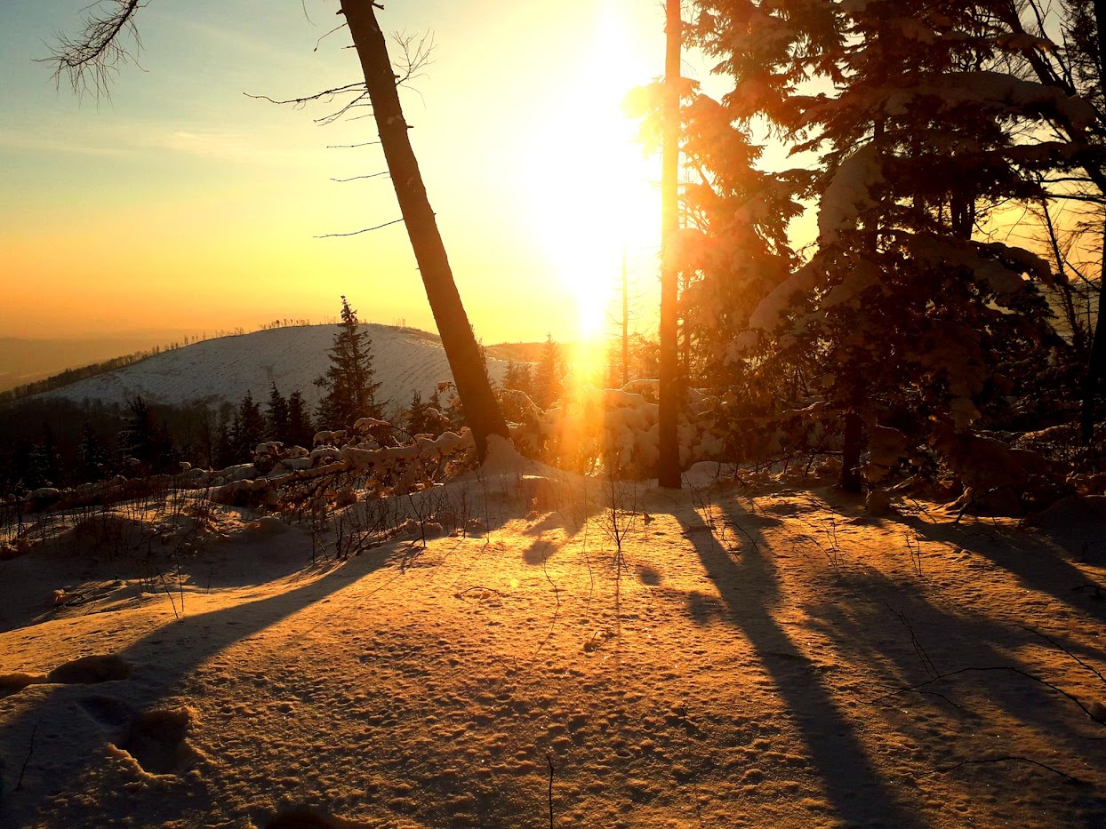 Najpiękniejsza tegoroczna zimowa wycieczka na Biskupią Kopę miała miejsce 4 marca. Wtedy wybrałem się na wschód słońca. Zjawisko podziwiałem z tarasu Schroniska pod Biskupią Kopą. Wówczas słońce wschodziło nad Srebrną Kopą. Temperatura -15°C, promienie ciepłej barwy wschodzącego słońca w połączeniu ze śniegiem dawały niesamowity efekt. Później z południowych stoków Kopy miałem okazję podziwiać jeszcze oświetlone w porannym słońcu szczyty Jeseników z Pradziadem i Keprnikiem, Śnieżnik oraz Góry Rychlebskie. Kocham wschody słońca w górach! :D