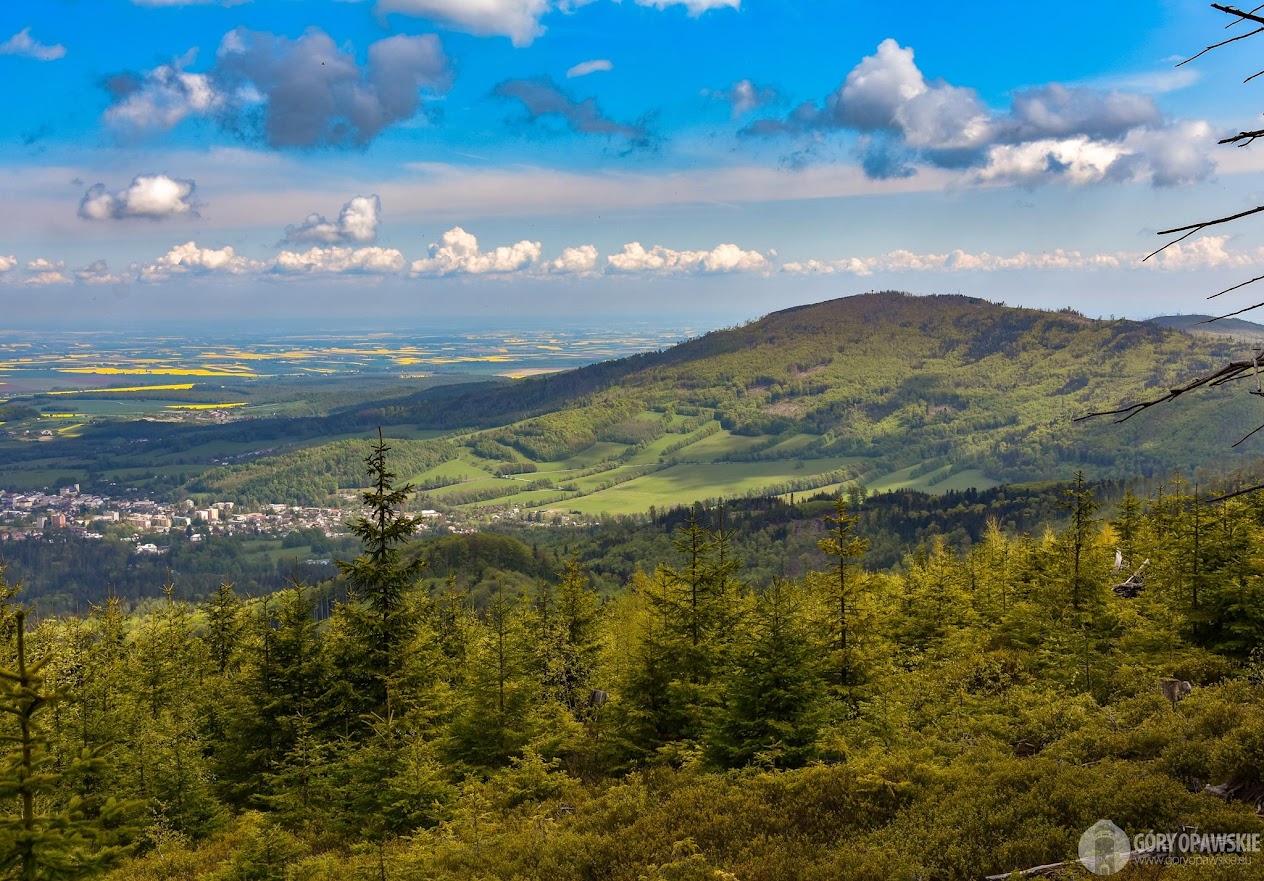Następnie ruszamy w górę niebieskim szlakiem i stromo pniemy się borem świerkowym na grzbiet Příčnego Vrchu, przechodząc obok średniowiecznych sztolni wydobycia złota. Na grzbiecie schodzimy na chwilę z trasy na moje ulubione Taborskie Skały z widokami. Punkt widokowy (wieżyczka) powoli zarasta świerkami, ale niektóre drzewa mimo młodego wieku wyglądają jakby zaraz miały uschnąć. Widoczność dziś nawet dopisuje, widok sięga Śnieżnika Gór Sowich. W innym miejscu grzbietu również przystajemy na zdjęcia w kierunku północnym, na Biskupią Kopę, Zlate Hory, Polskę, ładnie wyglądają żółte pola rzepaku. Podłączam też pod swój aparat obiektyw 600 mm od Roberta. To jest sprzęt! 😅