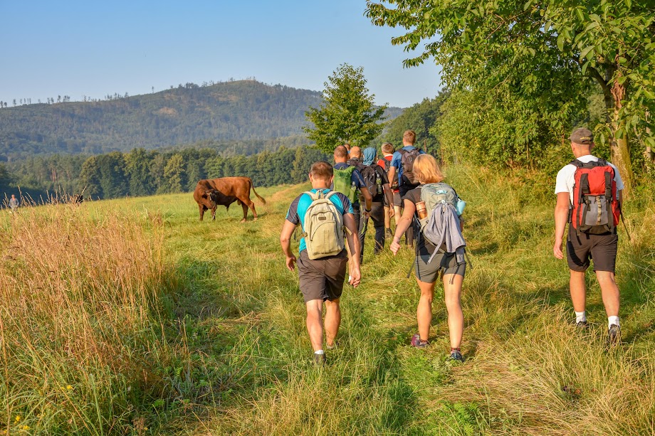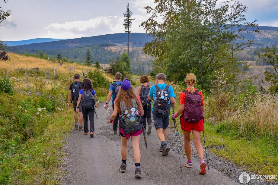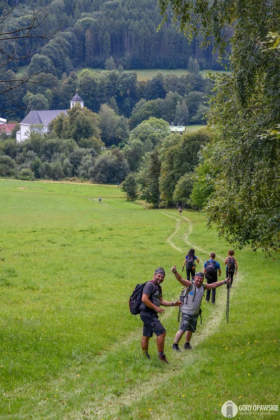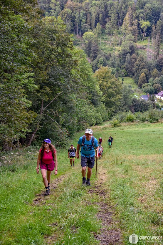W Petrovicach połowa trasy, zmieniamy kolor szlaku na zielony i maszerujemy w górę miejscowości, a następnie wychodzimy z doliny i wspinamy się najbardziej stromym podejściem na trasie. Jesteśmy w masywie Solnej i Kravi Hory, najbardziej rozległej, dzikiej i odludnej części czeskich Gór Opawskich. Na rozdrożu robimy grupowe foto, szlak wypłaszacza się, by od Vojtův pramen znów piąć się ostrzej w górę.