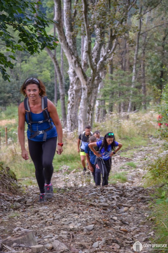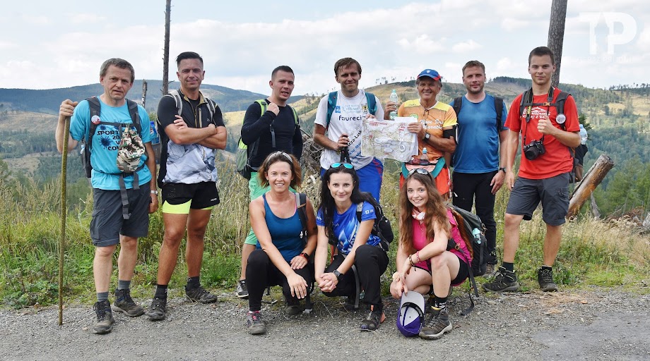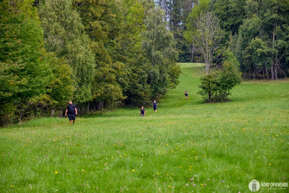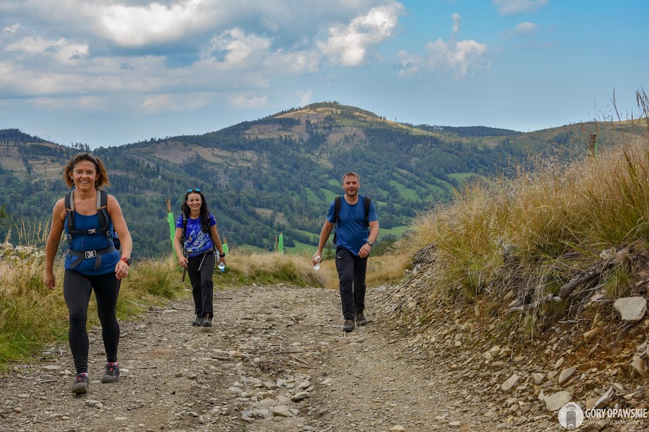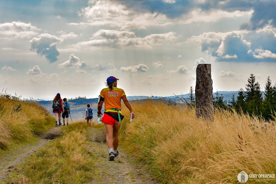 Od Solnej Hory (868 m) wędrujemy żółtym szlakiem grzbietowym pośród traw. To widokowy odcinek, ale ma też swoje minusy. Wraz z wycinką drzew zniknęło oznakowanie szlaku, mi wędrówka nie przysparza problemów, bo znam teren, ale uczestnikom nieznającym już tak, dlatego w tym masywie często dochodziło do błędów nawigacyjnych. Szlak z wyrębów wychodzi na górskie łąki-pastwiska dla krów i obok wieży wojskowej na Kravi Horze schodzimy do wiaty pod szczytem przy której III punkt kontrolny. Ten już z obsługą, można posilić się wodą, batonami, rogalikami z marmoladą i specjalną nalewką – eliksirem na odciski.