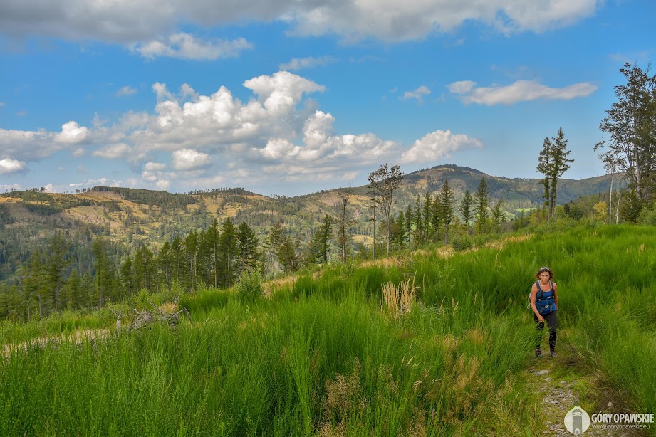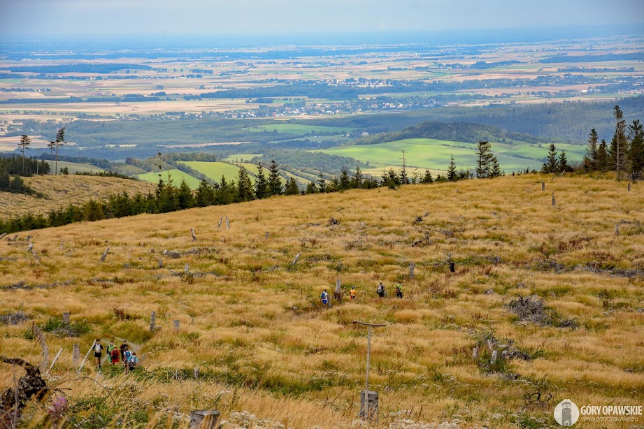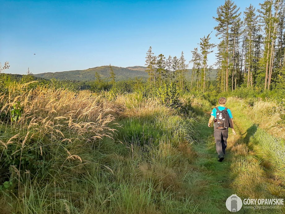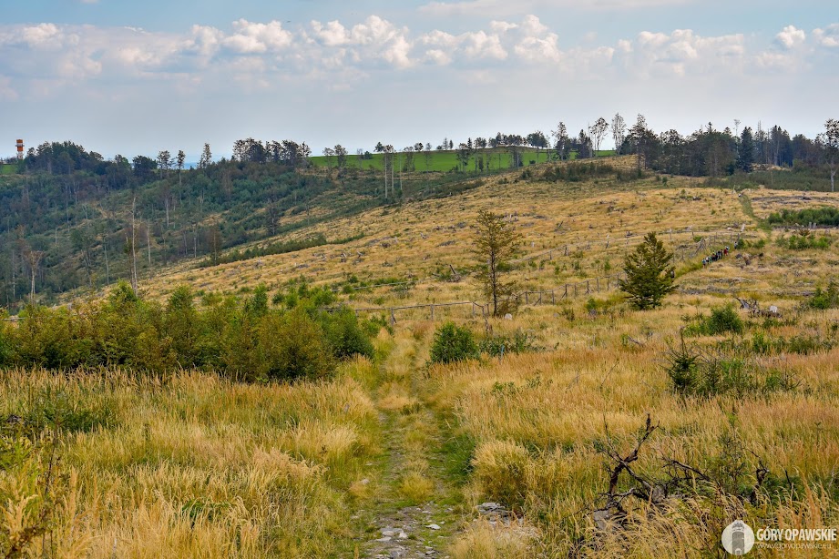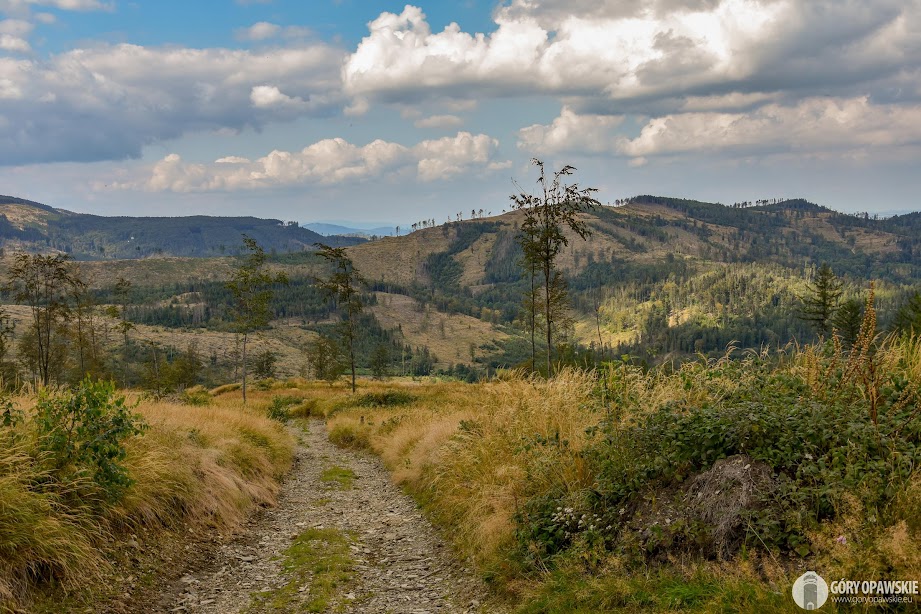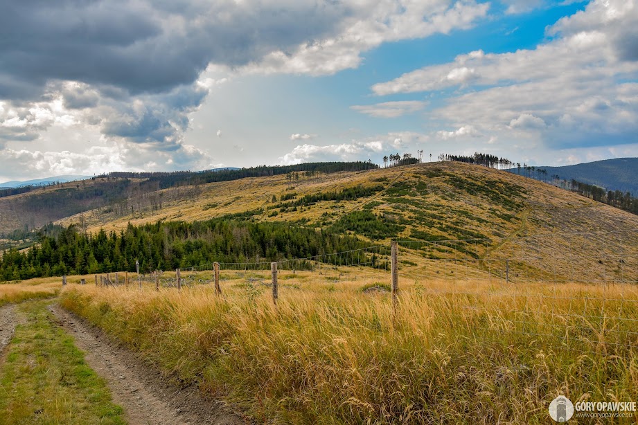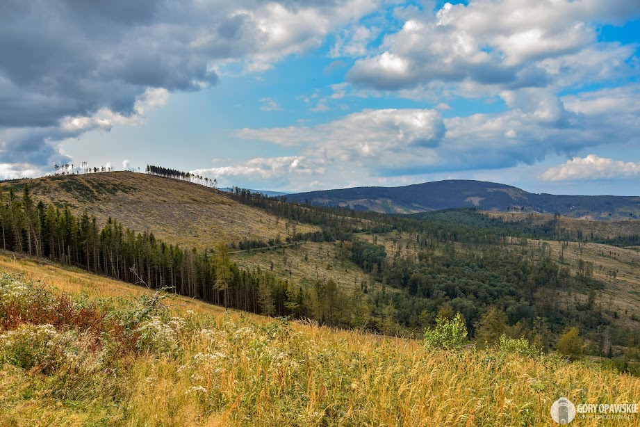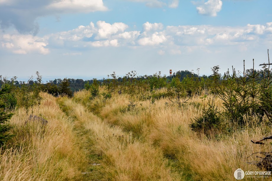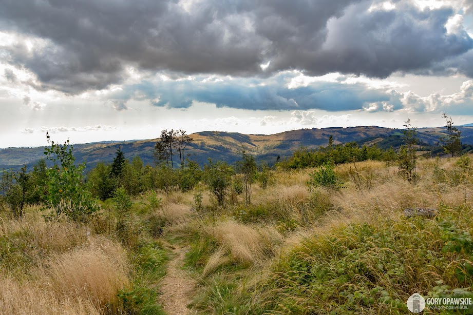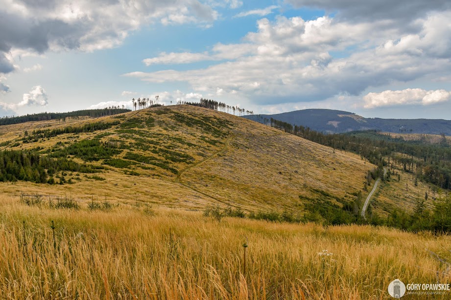 Wychodzimy na „opawskie połoniny”, tak można nazwać krajobraz jaki dominuje w tym masywie od kilku lat. Jeszcze do niedawna cały porośnięty był borem świerkowym, klęska kornika doprowadziła do ogromnych wycinek. Dziś lasu już nie ma, ogromne połacie stoków porasta pożółkła trawa, wokół roztacza się piękny widok, krajobraz ma coś z bieszczadzkich połonin.
