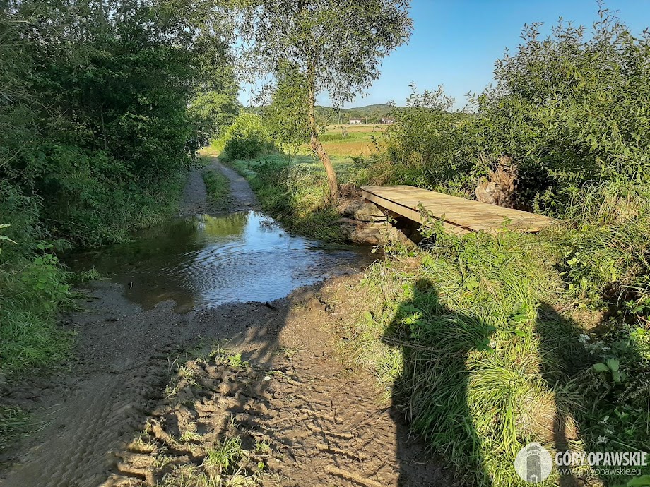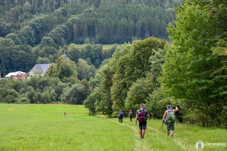 W Dębowcu kolor szlaku zmieniamy na czerwony i przez Długotę schodzimy do Wieszczyny. Dalej tym samym szlakiem podążamy wśród pól z widokiem na Góry Opawskie, przekraczamy Zamecki Potok już po nowym wykonanym dzień wcześniej drewnianym mostku. Mijamy pastwisko z krowami, w oddali unoszą się lekkie mgły.