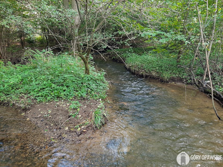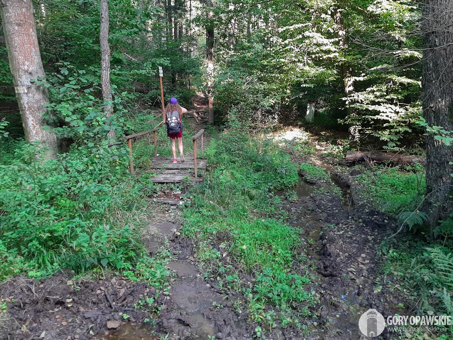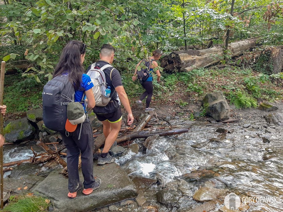 Następnie przez Młyńską Górę schodzimy do Moszczanki, przekraczamy Złoty Potok, idziemy pod dużym mostem czeskiej tranzytowej linii kolejowej do Pokrzywnej, następnie schodzimy do Cichej Doliny. Teraz Doliną Bystrego Potoku wędrujemy w górę strumienia, w dwóch miejscach by go przeskoczyć trzeba było troszkę się natrudzić, niektórzy zdejmowali buty. Wyżej na szlaku było jeszcze gorzej ponieważ Bystry Potok płynie po ścieżce, maszerowaliśmy więc po błocie, wodzie i w zaroślach. Tak wspięliśmy się do schroniska pod Biskupią Kopą, przy którym II punkt kontrolny, także samoobsługowy. Na stoliku podbijamy pieczątkę. Po podbiciu karty decydujemy się, że dłuższą przerwę robimy na wierzchołku Biskupiej Kopy.
