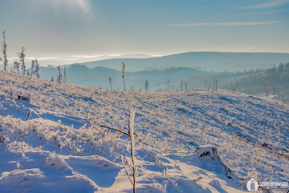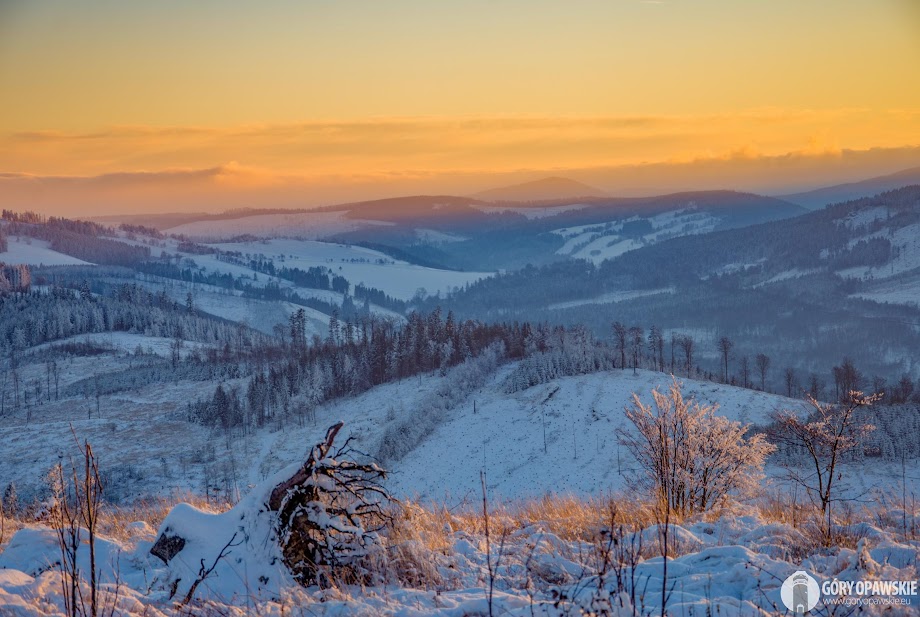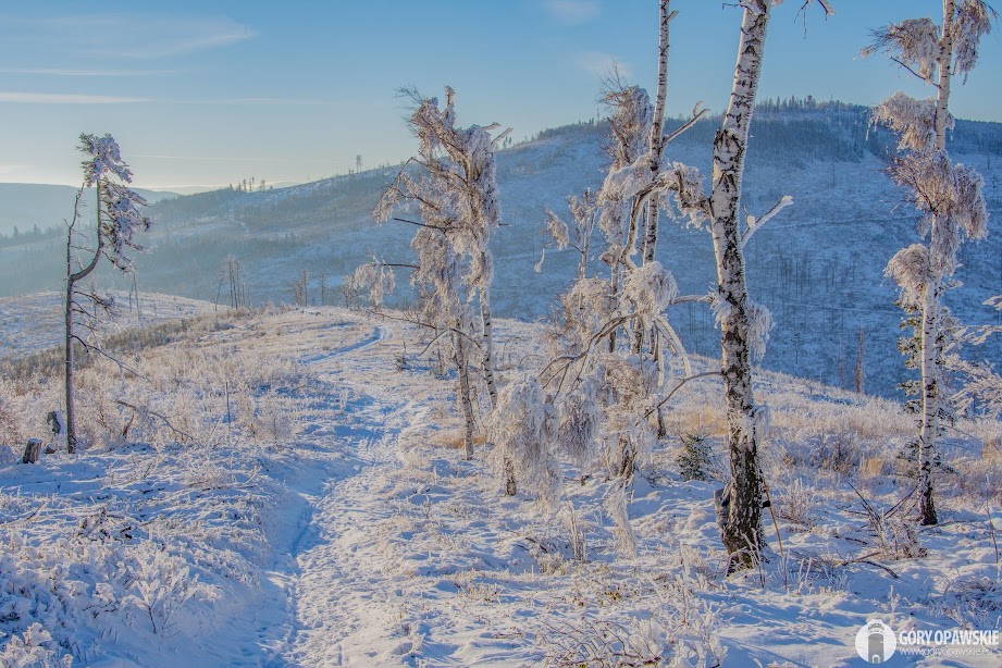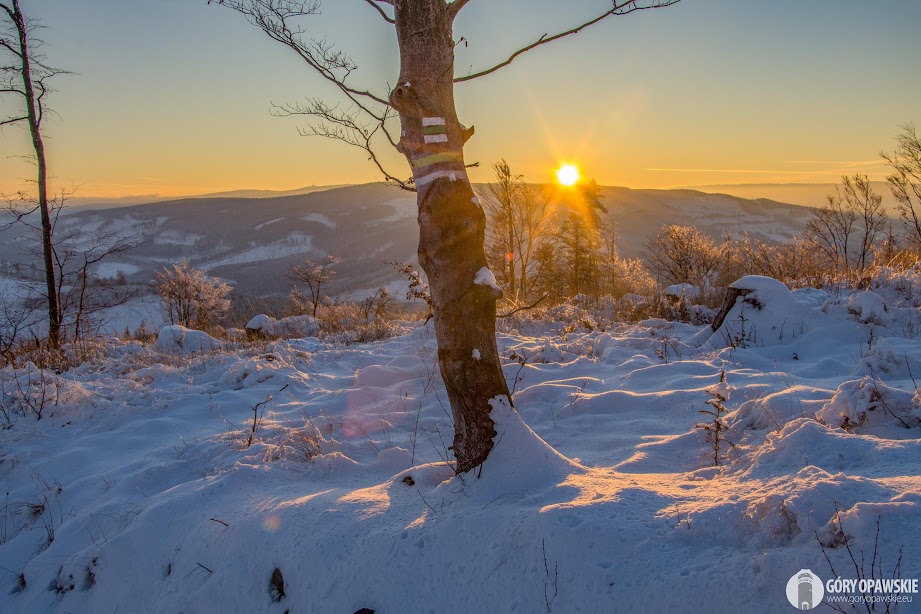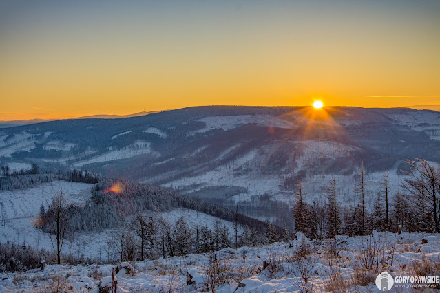 W poniedziałek 30 listopada Góry Opawskie zabieliły się. Pojawił się pierwszy śnieg tej zimy, temperatury spadły poniżej zera. We wtorek (1.12) chmury rozeszły się i zrobiła się piękna zimowa pogoda. Postanowiłem wykorzystać ten dzień na wędrówkę szlakami Gór Opawskich. Ruszyłem z Pokrzywnej czerwonym szlakiem przez Szyndzielową Kopę, Zamkową Górę, Srebrną Kopę na Biskupią Kopę. W wyżej partii szczytów leży obecnie około 20 cm śniegu. Krajobraz podczas wędrówki był piękny - typowo zimowy, otulone śniegiem i szadzią drzewa oraz trawy "opawskich połonin". Dodatkowo z Biskupiej Kopy miałem okazję podziwiać zachód słońca za Příčnym Vrchem, najwyższym szczytem naszego pasma. Zachód można nazwać pierwszym zachodem słońca tegorocznej zimy, choć do tej kalendarzowej jeszcze 20 dni to meteorologiczna zaczyna się wraz z początkiem grudnia. Miejmy nadzieję, że tej zimy będzie jeszcze sporo śnieżnych, mroźnych dni z piękną słoneczną pogodą. Krajobraz i zdjęcia są wtedy niesamowite! 😍