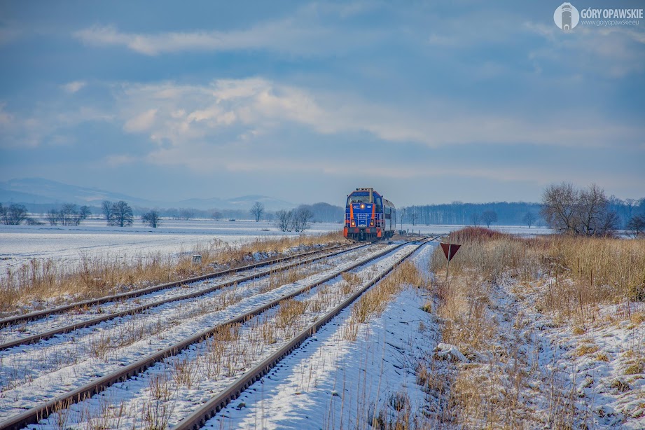 "KORMORAN" na Podsudeckiej na tle zimowych Gór Opawskich - masywu Srebrnej i Biskupiej Kopy przed wjazdem na stację Prudnik 8 stycznia 2021 r.