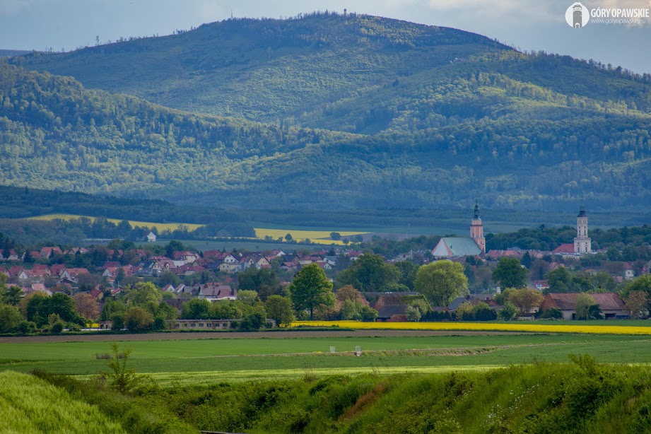 W tle panorama Prudnika: wieże kościoła św. Michała Archanioła, Ratusza, Wieża Woka oraz kościoła śś. Piotra i Pawła. Ponad nimi dominuje potężny od tej strony masyw Srebrnej oraz Biskupiej Kopy.