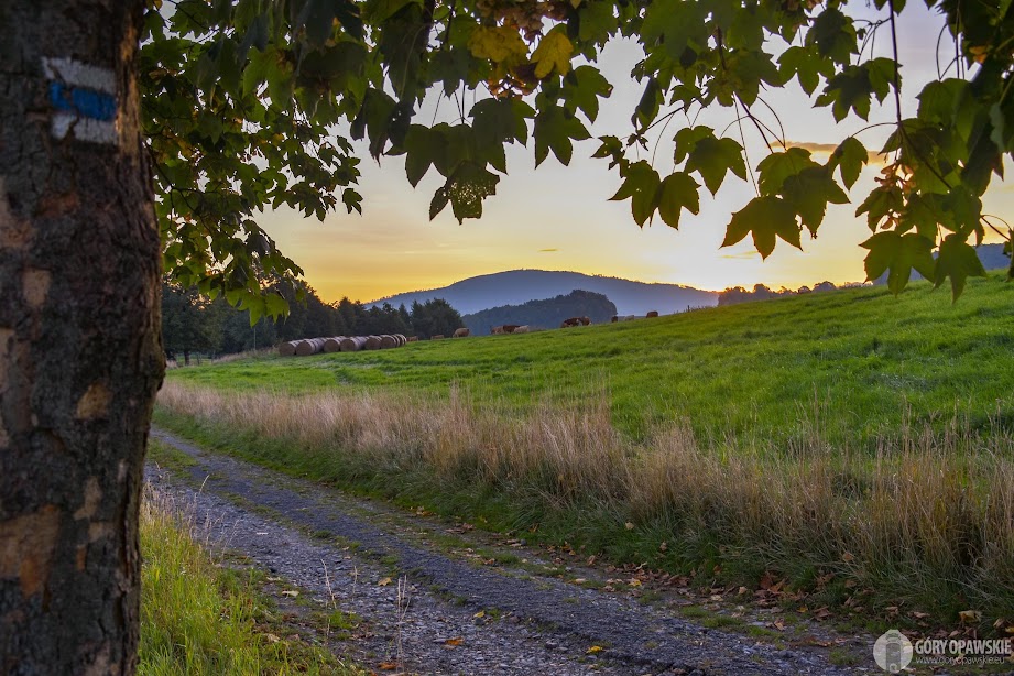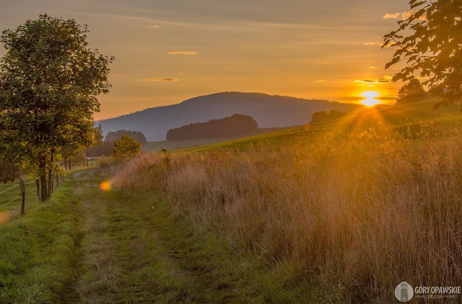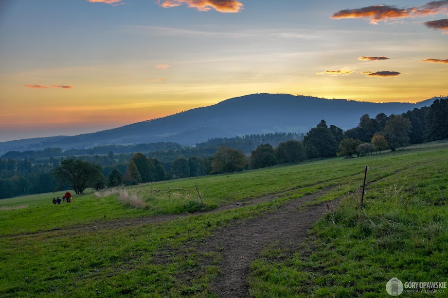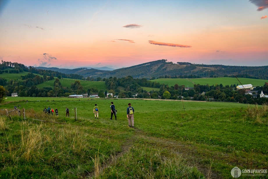 Za Ondřejovicami jeszcze chwila wędrówki przez łąki z bydłem, za plecami robi się czerwono – nad Biskupią Kopą wschodzi słońce.