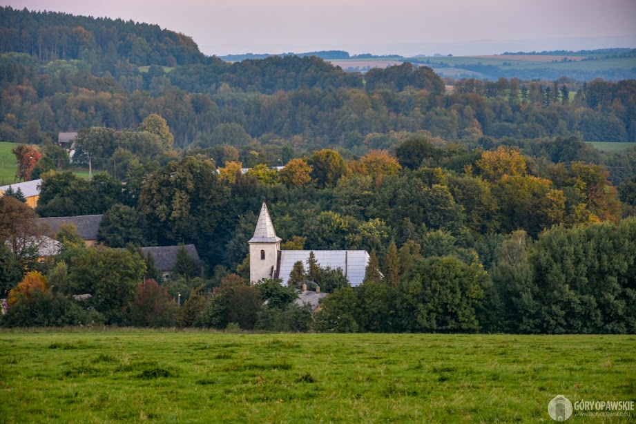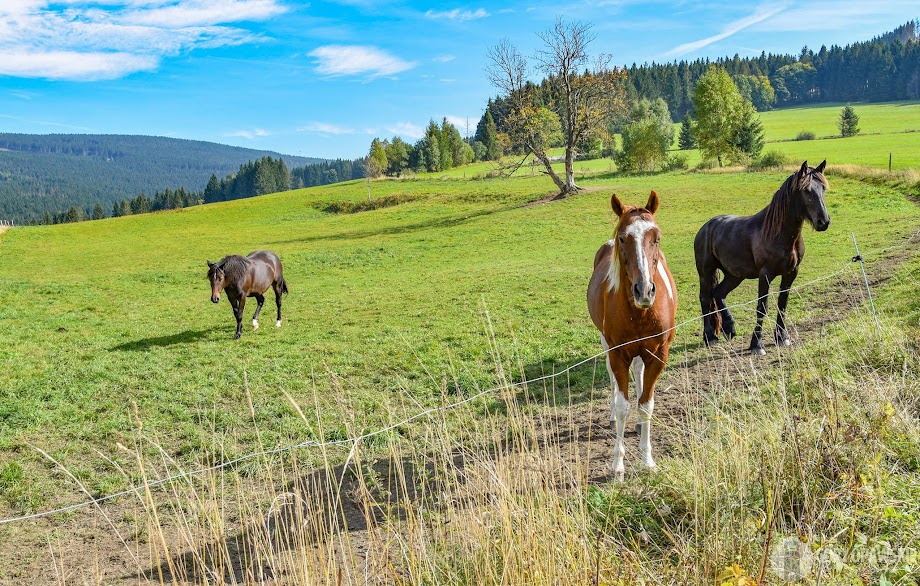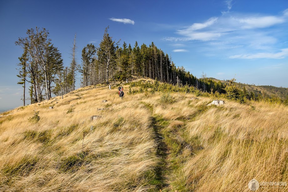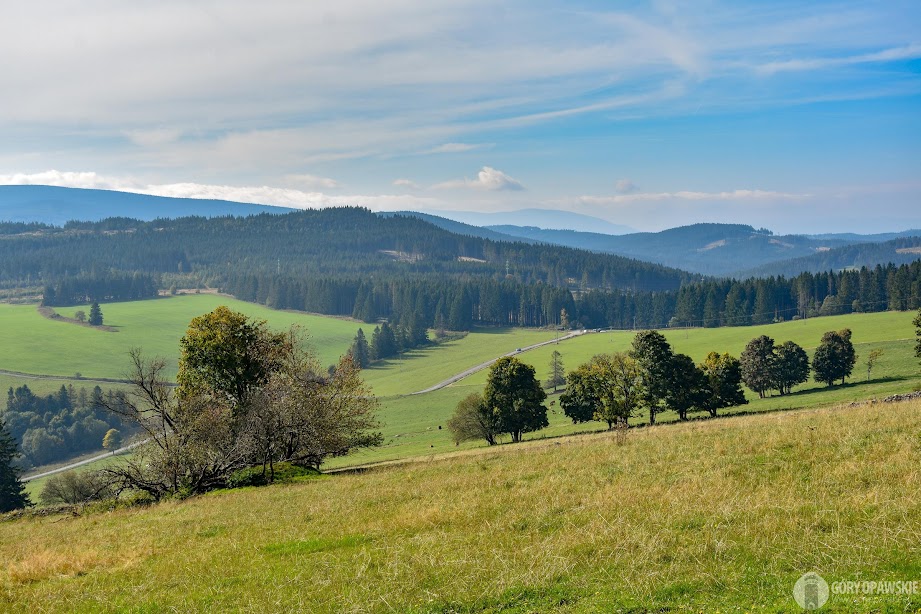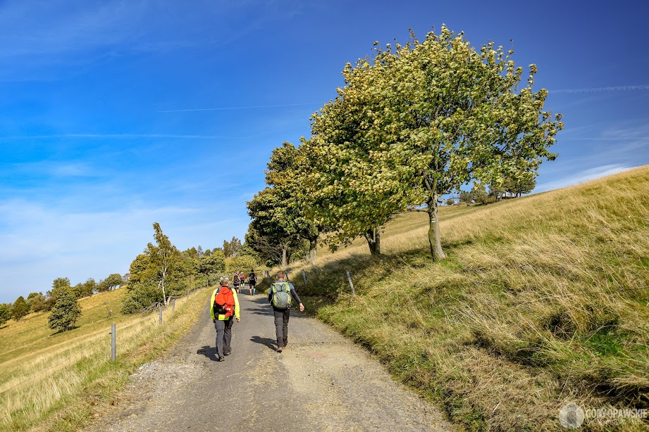 Od Chaty podejście asfaltową drogą z zielonymi znakami, potem ścieżką na ruiny zamku Kobrštejn. Dalej bardzo stromym zejściem schodzimy na górskie łąki nad Hornim Udoli. Tutaj znów widać jakie potężne straty wyrządził kornik w drzewostanach, potężne połacie stoków porasta dziś żółta trawa gdzie okiem sięgać. Łysa Kopa po polskiej stronie to przy tym pikuś… Maszerujemy ponad łąkami, obok nas pasą się towarzyskie konie a w dolinie dominuje ładna kamienna bryła kościoła św. Jana Chrzciciela w Hornim Udoli.😊