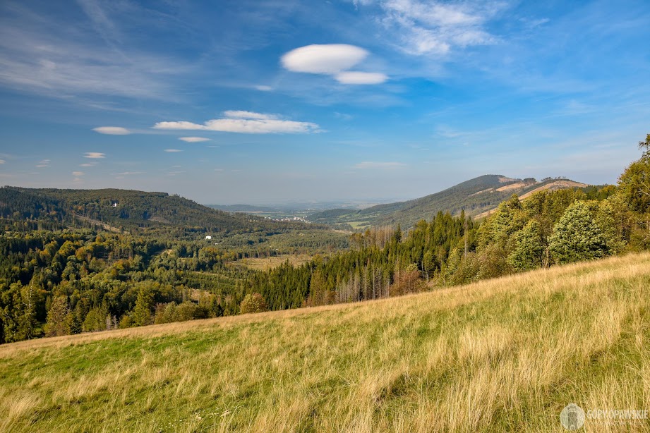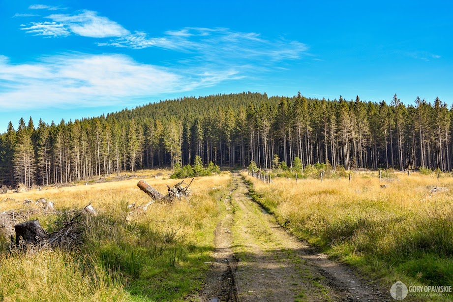 Od dworca kolejowego, żeby nie iść po asfalcie wytyczono nową ścieżkę przez łąkę i obok ogródków. Podążamy więc tędy następnie zielonym szlakiem także z nowo utwardzoną ścieżką do skansenu górnictwa złota, w pobliżu Zlatorudnych Mlynów. Przechodzimy pod pastuchem i wkraczamy na pastwisko, do niedawna biegł tędy szlak turystyczny, niestety zmienił się właściciel i szlak na tym odcinku został zlikwidowany. Szkoda, bo był to malowniczy odcinek z widokami. Dziś jednak możemy tędy przejść. Krowy tym razem są daleko od nas za pastuchami.