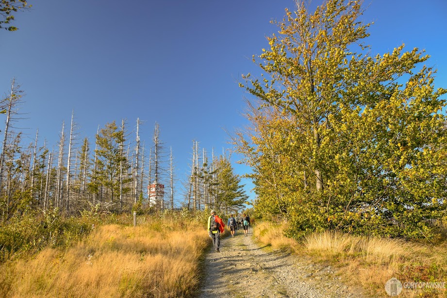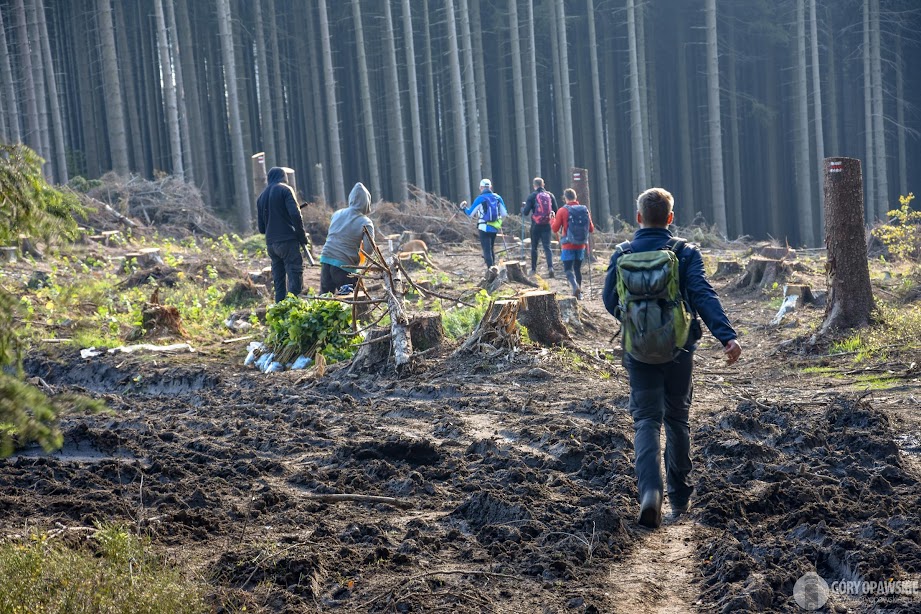 Dalej podążamy do źródeł Javornej i żółtym szlakiem trawersem Zlatego Chlumu do baru przy Čertovych kamenach, na tym odcinku mijamy pracowników z sadzonkami, będą sadzić las. Zrywa się silny wiatr… będzie powtórka z tamtego roku, kiedy to zmagaliśmy się z bardzo silnym wiatrem fenowym? Od tego miejsca rozpoczynamy wspinaczkę na Zlatý Chlum. To najtrudniejsze podejście na trasie, ale mi idzie bardzo sprawnie. Na szczycie góry punkt kontrolny – pieczątka w wieży.