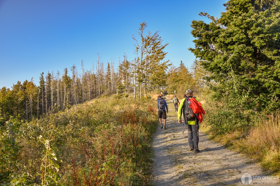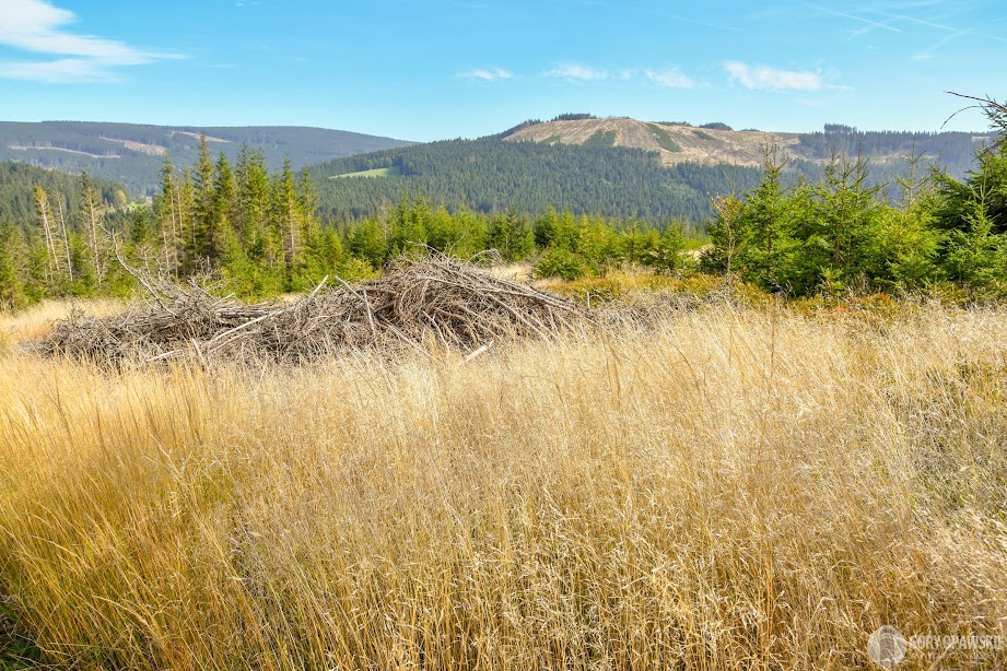 Tym razem tutaj przystajemy dosłownie na minutę a następnie wybieramy czerwony szlak, którym podążamy do malowniczej wsi Rejviz. Po drodze mijamy kolejne świeże wycinki świerków, które dają nowe perspektywy widokowe. Szczyty Jeseników schowane są w ciemnych chmurach – wale fenowym, wiatr na tym odcinku dokucza najbardziej. Prace trwają, więc teren i szlak w niektórych miejscach jest błotnisty, na dopiero co wyciętych terenach pracują robotnicy i sadzą młode buki. W Polsce po wycince leśnicy czekają jakiś czas by ziemia się nasłoneczniła, użyźniła. Czesi sadzą od razu.