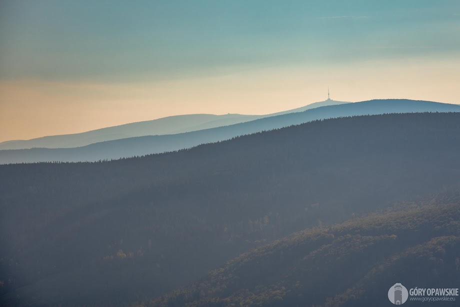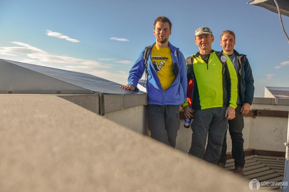 Ostatnią przerwę zarządzamy na szczycie Biskupiej Kopy, który osiągamy po 20 minutach. Pod wieżą pieczątka, w ramach uczestnika ZT mamy darmowy wstęp na wieżę. To wchodzimy, choć widoczność dziś nie powala. Coś tam jednak widać, nawet Jeseniki, bo zniknął wał fenowy 😃