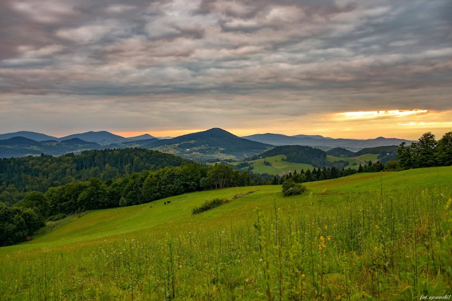 Na koniec jeszcze kilka zdjęć z dnia pierwszego, w którym przyjechaliśmy po południu. Pogoda była ładna, ale ten dzień poświęciliśmy na „walkę z naturą”.😋 Wieczorem poszliśmy jedynie na krótką wycieczkę po stokach Pasierbieckiej Góry, po lesie a potem w poszukiwaniu polany, na którą przed laty zaprowadził nas dziadek. Stoi tam samotny dom i roztacza się piękna panorama w kierunku zachodnim.😍 Słońce się schowało, niebo lekko poczerwieniało, ale tarcza schowała się w chmurach… była cisza, tylko w oddali na pastwisku, co chwilę muczała czarna krowa…
