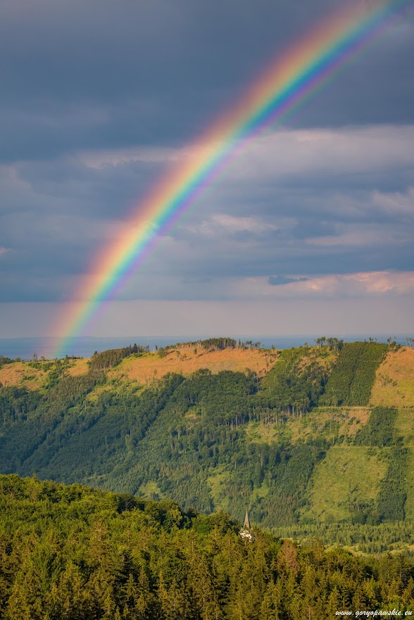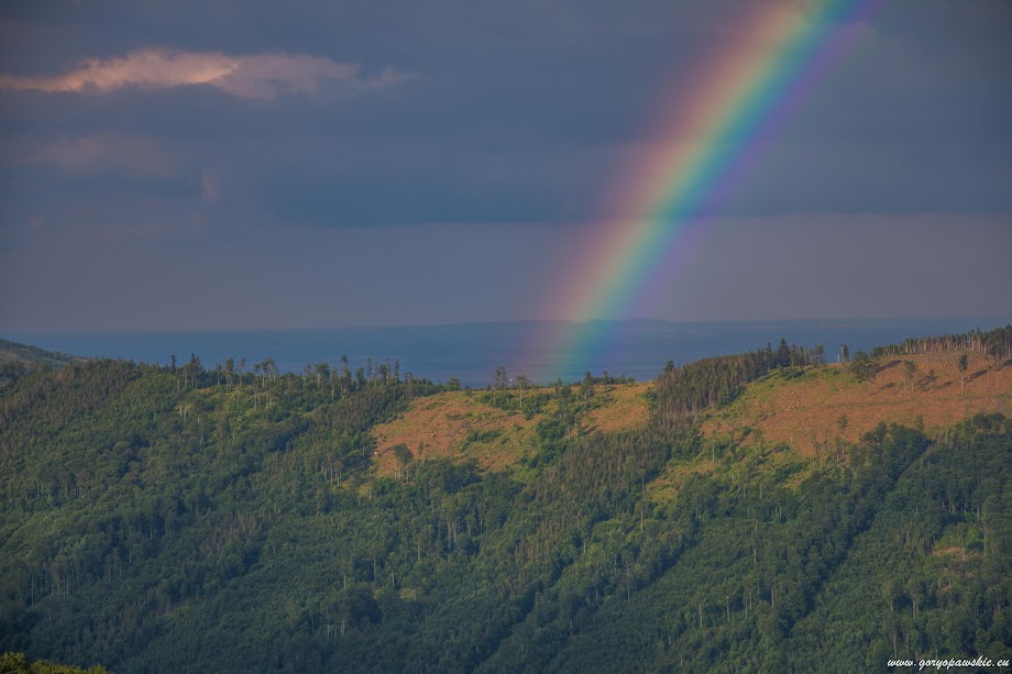 Następnie wspinamy się na Vyr a stąd dalej w górę. Gdy wychodzimy na bezleśny po wycinkach teren za plecami mamy piękną panoramę. Trawy falują na wietrze a w oddali Góra Parkowa, Zlate Hory, Biskupia Kopa, Srebrna Kopa, Vetrna i Solna Hora ponad nimi łuk tęczy, pięknie. Załapała się nawet Góra św. Anny. Chwilo trwaj!😊