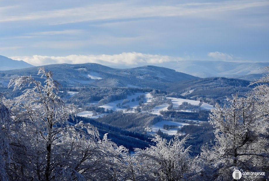 panorama na Dolinę Białej Głuchołaskiej oraz Jeseniki i Góry Rychlebskie. Stoki
